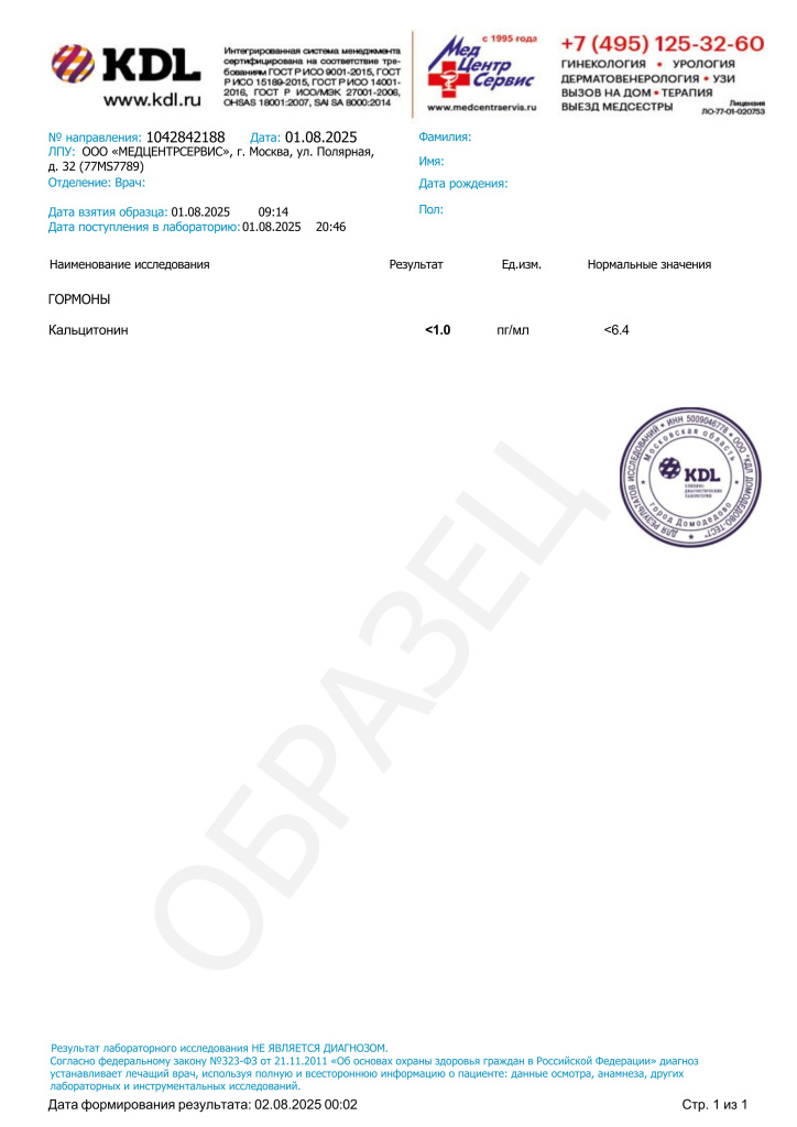 ВНИМАНИЕ! Информация в данном разделе предназначена исключительно для медицинских работников. Уровень гормона кальцитонина не должен оцениваться изолированно. Интерпретация анализа требует обязательного сопоставления с данными УЗИ щитовидной железы, результатами тонкоигольной аспирационной биопсии (ТАБ) и, при наличии показаний, результатами генетического тестирования (скрининг на MEN-синдромы).