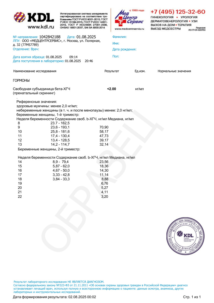 Полученные референсные значения служат лишь ориентиром для предварительной оценки рисков. Для точной интерпретации результата и постановки диагноза необходимо проконсультироваться с лечащим врачом (акушером-гинекологом или генетиком). Специалист проведёт комплексную оценку, сопоставив ваш уровень свободной бета-ХГЧ с точными сроками, весом и данными анамнеза.