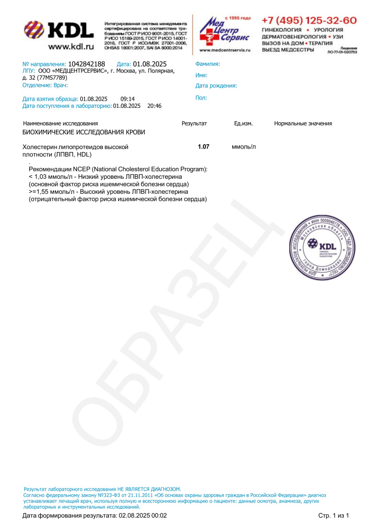 Анализ крови на холестерин-ЛПВП — это исследование уровня липопротеинов высокой плотности, так называемого "хорошего" холестерина. Тест является ключевой частью оценки липидного обмена и риска развития атеросклероза. Он показывает, насколько эффективно организм защищен от отложения избыточного холестерина в стенках сосудов. Исследование назначается в составе липидограммы для комплексной оценки сердечно-сосудистого риска, особенно у пациентов с гипертонией, сахарным диабетом и ожирением.