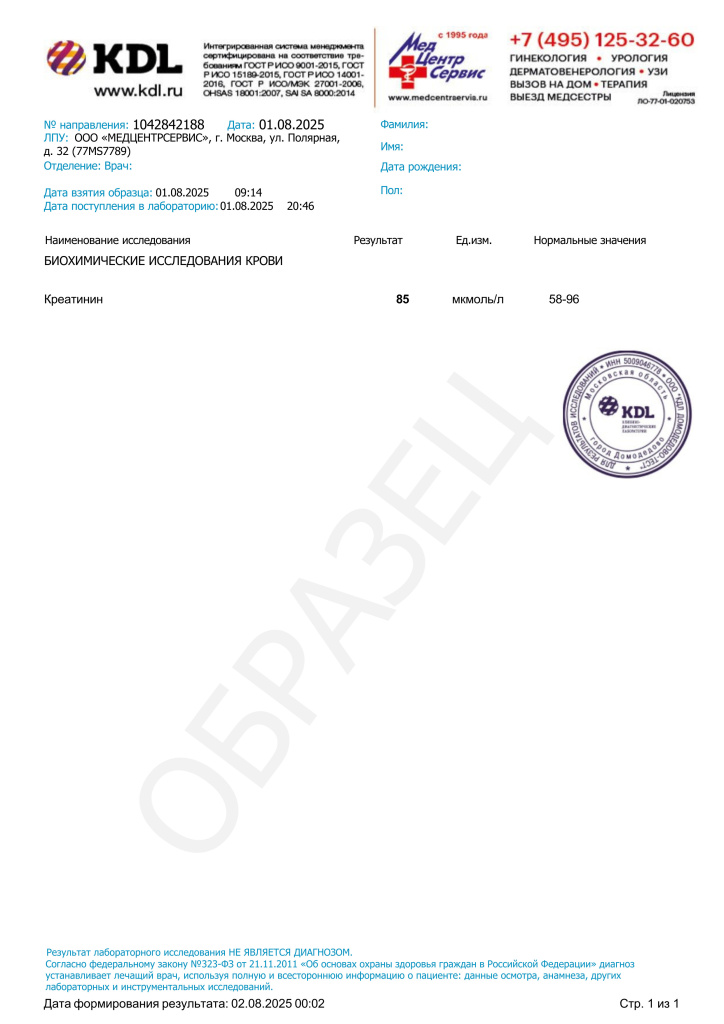 ВНИМАНИЕ! Информация в данном разделе предназначена исключительно для медицинских работников. Интерпретация уровня креатинина должна проводиться в совокупности с полной клинической картиной, анамнезом и результатами других лабораторных и инструментальных исследований.