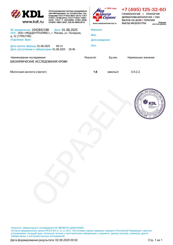 Исследование уровня молочной кислоты (лактата) — это биохимический анализ крови, который определяет концентрацию конечного продукта анаэробного гликолиза (расщепления глюкозы без участия кислорода). Этот показатель служит интегральным маркером тканевой гипоксии и нарушений кислотно-основного равновесия в организме.