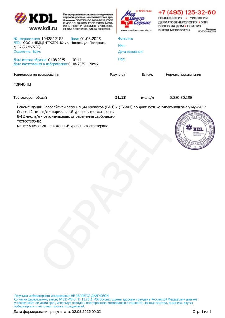 Полученные референсные значения служат лишь ориентиром для диагностики. Для точной интерпретации результата и постановки диагноза необходимо проконсультироваться с врачом-эндокринологом (или урологом/гинекологом). Специалист проведёт комплексную оценку, сопоставив ваш уровень с клинической картиной, данными анамнеза и результатами других обследований. Такой подход обеспечивает точную диагностику и позволяет избежать ошибочных заключений.