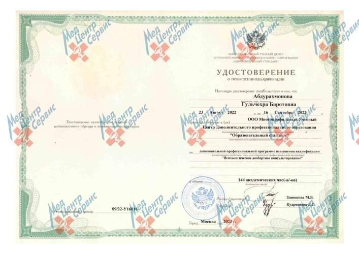 | 2022 г. | Повышение квалификации по дополнительной профессиональной программе "Психологическое доабортное консультирование". МУЦ ДПО "Образовательный стандарт" |