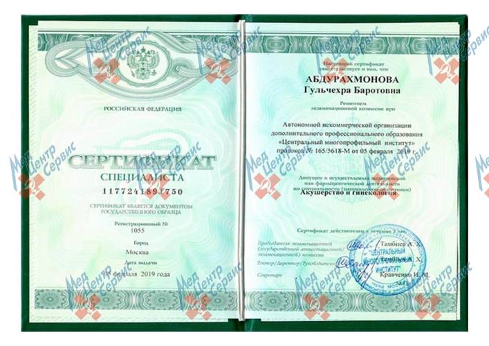 | 2019 г. | Повышение квалификации по специальности "Акушерство и гинекология". АНО ДПО "Центральный многопрофильный институт" |