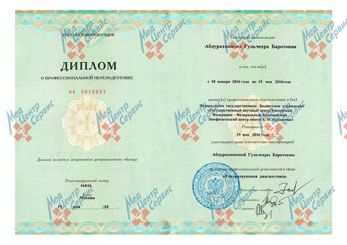 | 2016 г. | Повышение квалификации по специальности «Ультразвуковая диагностика», ФГБУ ГНЦ ФМБЦ им. А. И. Бурназяна ФМБА России |