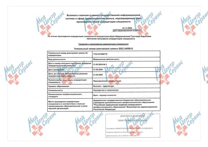 | 2024 г. | Периодическая аккредитация по специальности "Акушерство и гинекология". ФГБОУ ДПО РМАНПО МИНЗДРАВА РОССИИ Протокол № 2 от 21.05.2024 г |