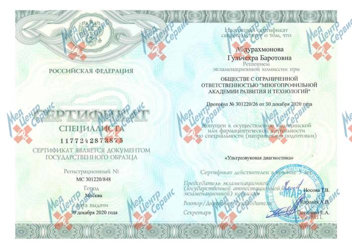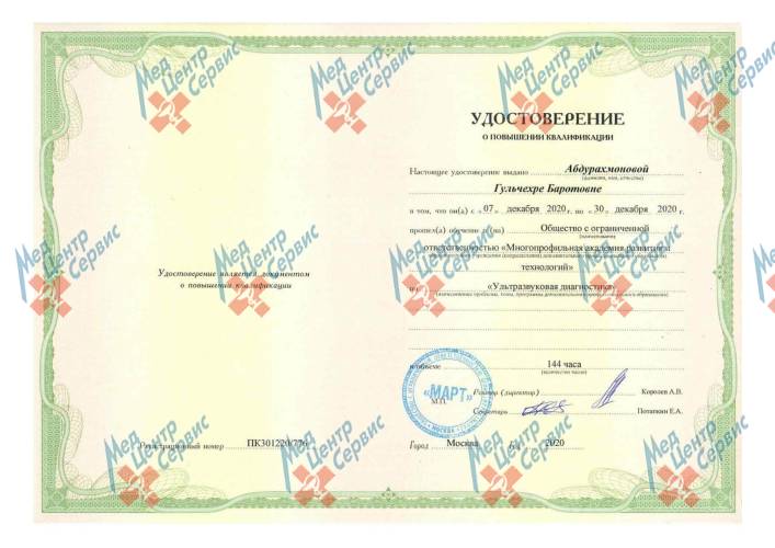 | 2020 г. | Повышение квалификации по специальности «Ультразвуковая диагностика». ООО "Многопрофильная академия развития и технологий" |