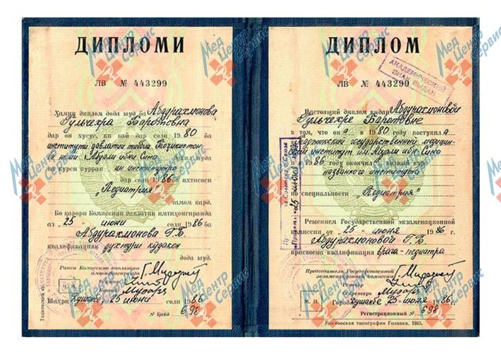| 1986 г. | Таджикский государственный медицинский институт им. Абуали ибн-Сино . Специальность «Лечебное дело». |