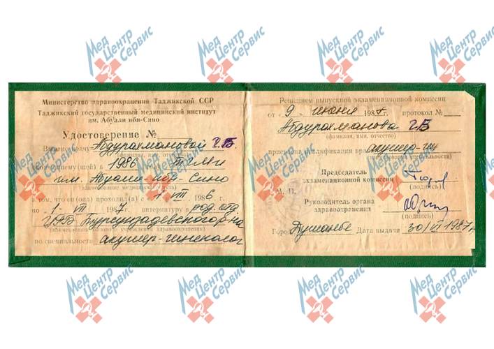 | 1987 г. | Интернатура по специальности «Акушерство-гинекология» ЦРБ Турсунзадевского р-на |