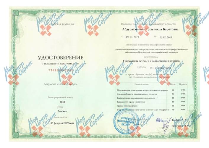 | 2019 г. | Повышение квалификации по программе "Гинекология детского и подросткового возраста". АНО ДПО "Центральный многопрофильный институт" |