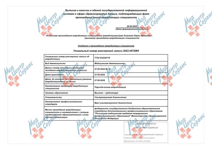 | 2024 г. | Периодическая аккредитация по направлению «Ультразвуковая диагностика». ФГБОУ ДПО РМАНПО МЗ РФ |