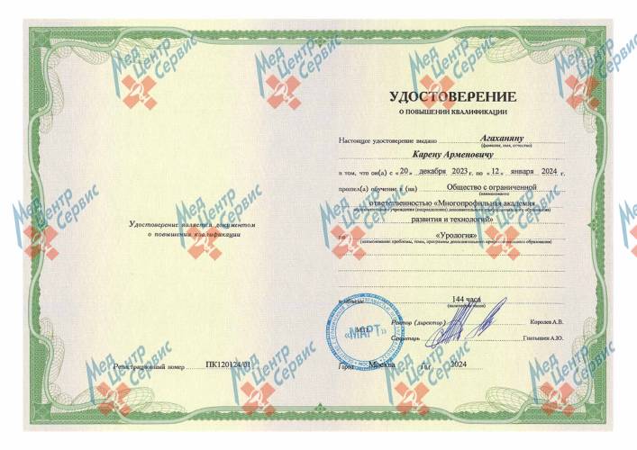 | 2024 г. | Повышение квалификации по специальности "Урология". ООО МАРТ |