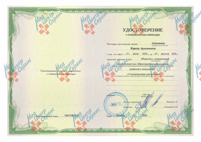 | 2024 г. | Повышение квалификации по специальности "Ультразвуковая диагностика". ООО МАРТ |