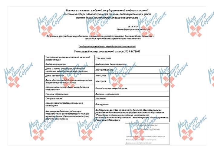 | 2024 г. | Периодическая аккредитация по специальности «Урология». ФГБОУ ДПО РМАНПО МЗ РФ |