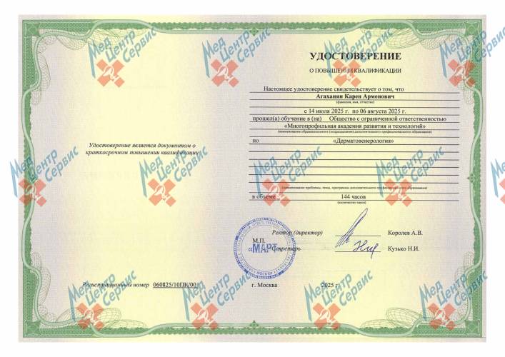 | 2020 г. | Повышение квалификации по специальности "Дерматовенерология". ООО "Многопрофильная академия развития и технологий". |