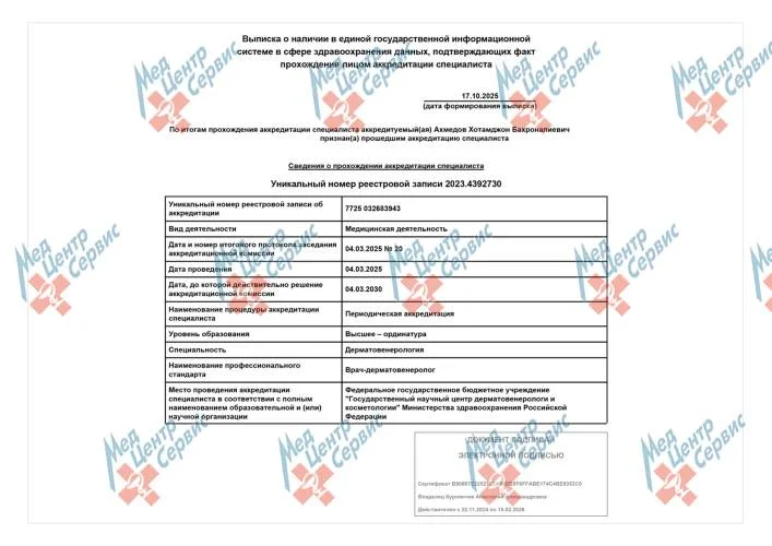 | 2025 г. | Периодическая аккредитация по специальности «Дерматовенерология». ФГБОУ ДПО РМАНПО МЗ РФ Протокол № 20 от 04.03.2025 г. |