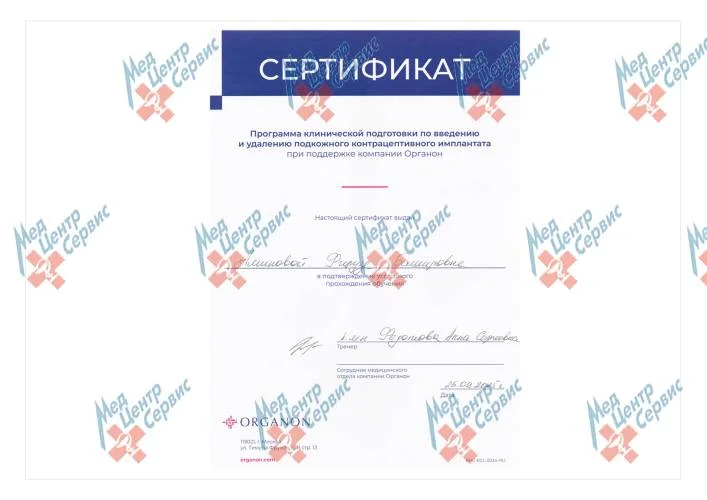 | 2025 г. | Прохождение обучения по Программе клинической подготовки по введению и удалению подкожного контрацептивного имплантата при поддержке компании Органон |