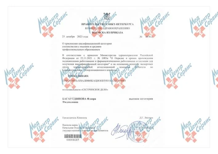 2018 г. | Присвоена высшая квалификационная категория по специальности «Сестринское дело» решением Территориальной аттестационной комиссии Комитета по здравоохранению Правительства Санкт-Петербурга |