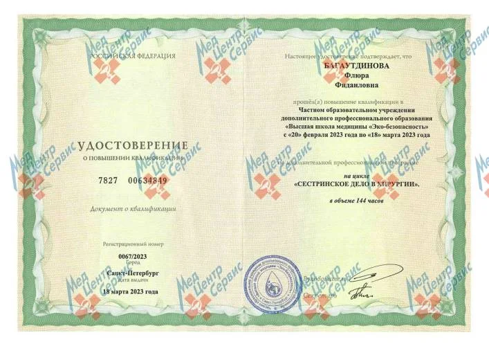 2023 г. | Повышение квалификации по дополнительной профессиональной программе на цикле «Сестринское дело в хирургии» |