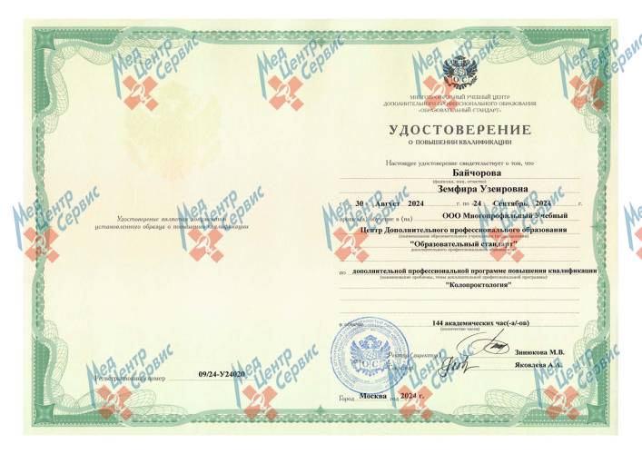 | 2024 г. | Повышение квалификации по дополнительной профессиональной программе "Колопроктология". ООО МУЦ ДПО "Образовательный стандарт" |