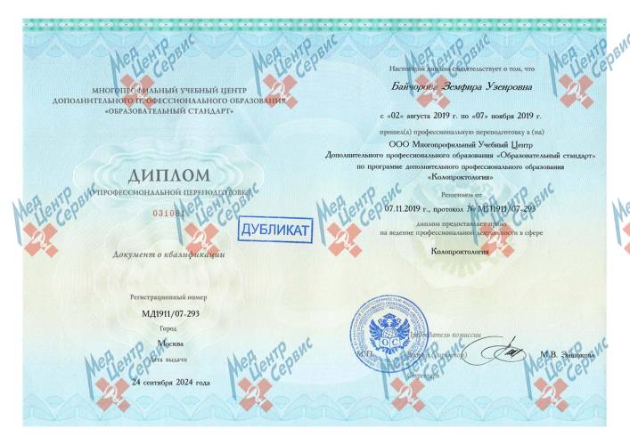 | 2019 г. | Профессиональная переподготовка по специальности «Колопроктология». ООО МУЦ ДПО «Образовательный стандарт» |