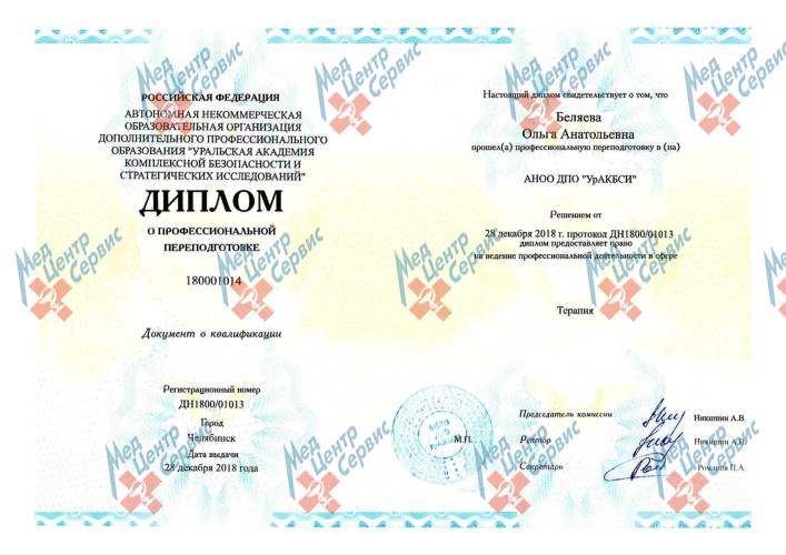 | 2018 г. | Профессиональная переподготовка по специальности «Терапия». АНОО ДПО УрАКБСИ |