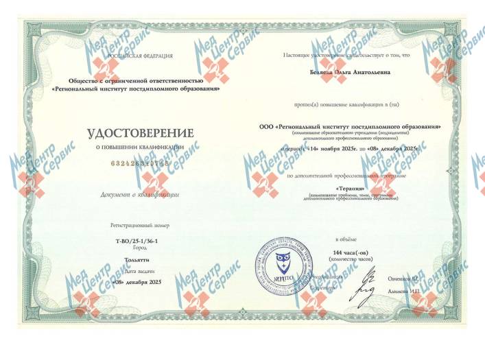 | 2025 г. | Повышение квалификации по дополнительной профессиональной программе «Терапия». ООО РИПО |