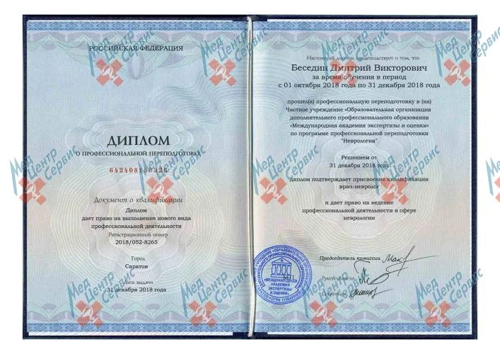 | 2018 г. | Профессиональная переподготовка по специальности «Неврология». ЧУ ОО ДПО «Международная академия экспертизы и оценки» |