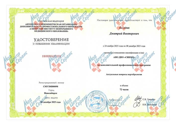 | 2025 г. | Повышение квалификации по дополнительной профессиональной программе «Актуальные вопросы вертебрологии» |