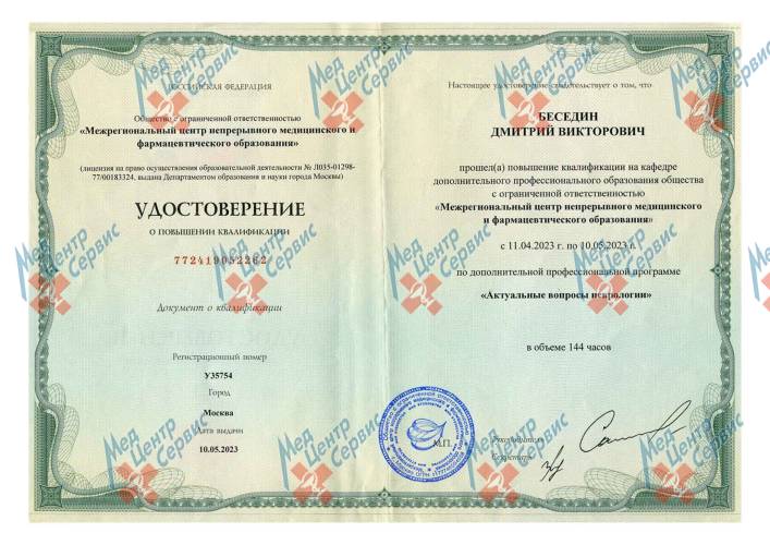 | 2023 г. | Повышение квалификации по дополнительной профессиональной программе «Актуальные вопросы неврологии». ООО «Межрегиональный центр непрерывного медицинского и фармацевтического образования» |