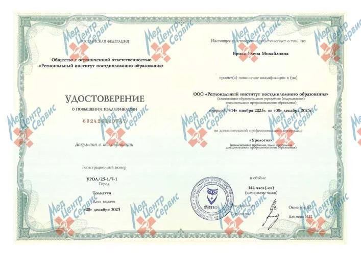 | 2025 г. | Повышение квалификации по дополнительной профессиональной программе «Урология». ООО РИПО |