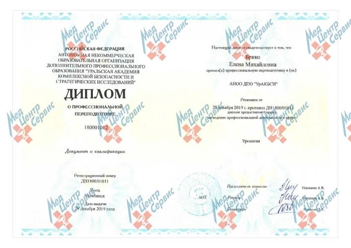 | 2019 г. | Профессиональная переподготовка по специальности «Урология». АНОО ДПО УрАКБСИ |