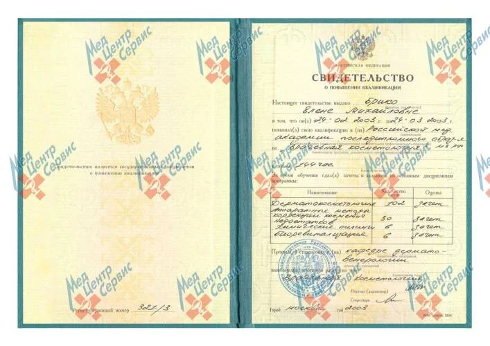 | 2003 г. | Повышение квалификации по направлению "Врачебная косметология". Российская медицинская академия последипломного образования МЗ РФ |