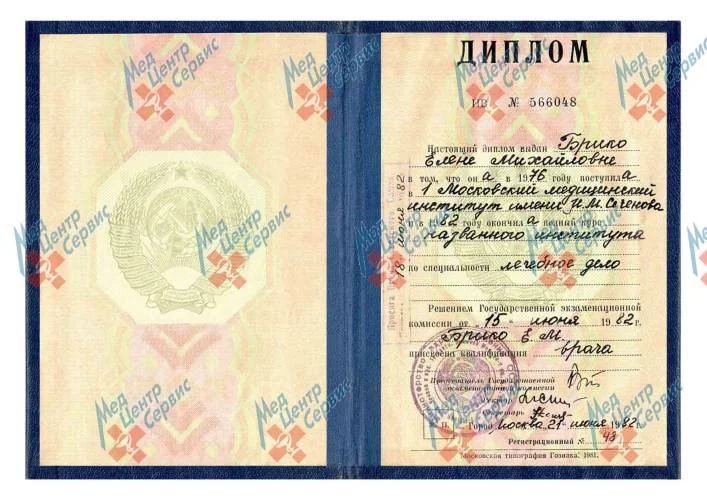 | 1982 г. | Диплом по специальности "Лечебное дело". Первый Московский медицинский институт им И.М. Сеченова |