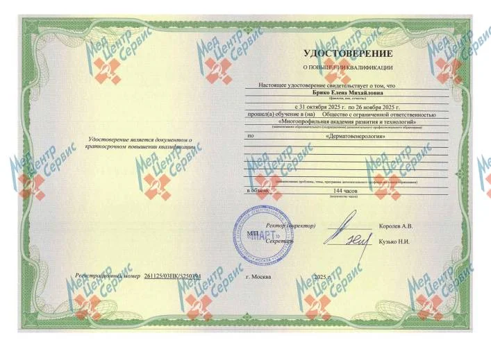 | 2025 г. | Периодическая аккредитация по специальности «Дерматовенерология». ФГБОУ ДПО РМАНПО МЗ РФ Протокол № 107 от 23.12.2025 г. |
