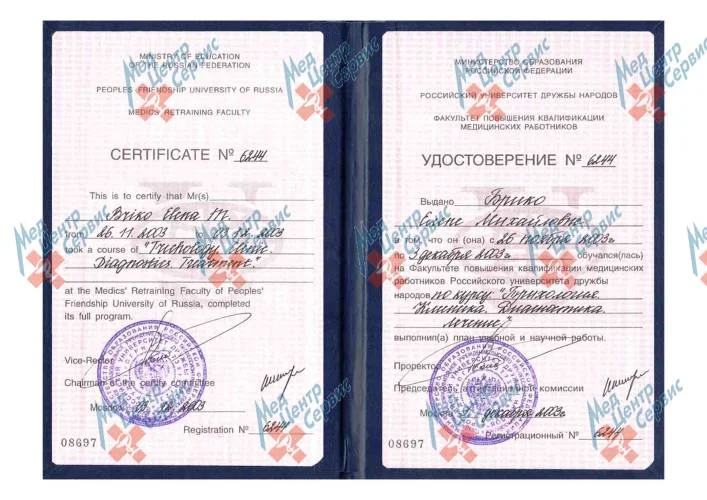 | 2003 г. | Повышение квалификации по курсу "Трихология. Клиника. Диагностика. Лечение". ФПК МР РУДН |