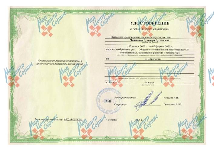 | 2025 г. | Повышение квалификации по дополнительной профессиональной программе «Нефрология». ООО МАРТ |