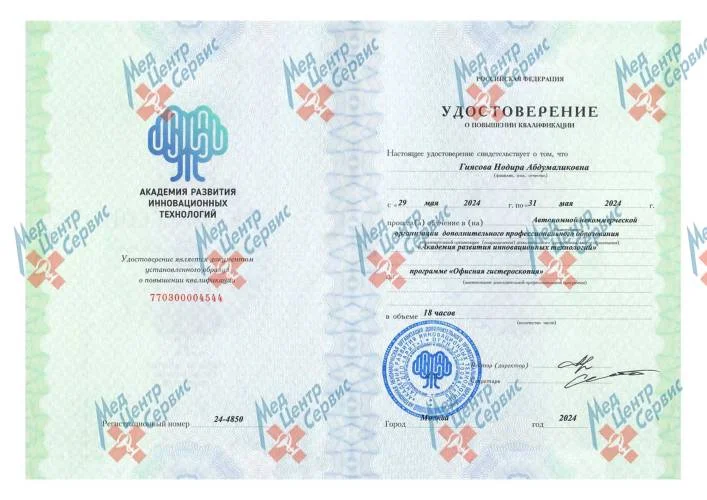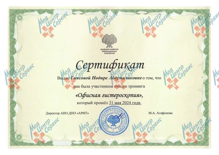 | 2024 г. | Повышение квалификации по программе «Офисная гистероскопия». АНО ДПО «Академия развития инновационных технологий» |