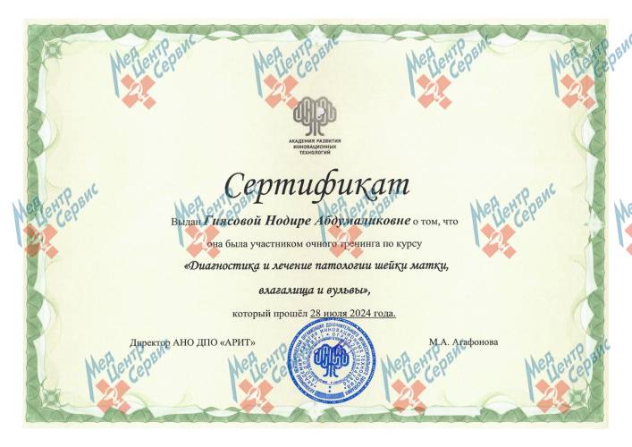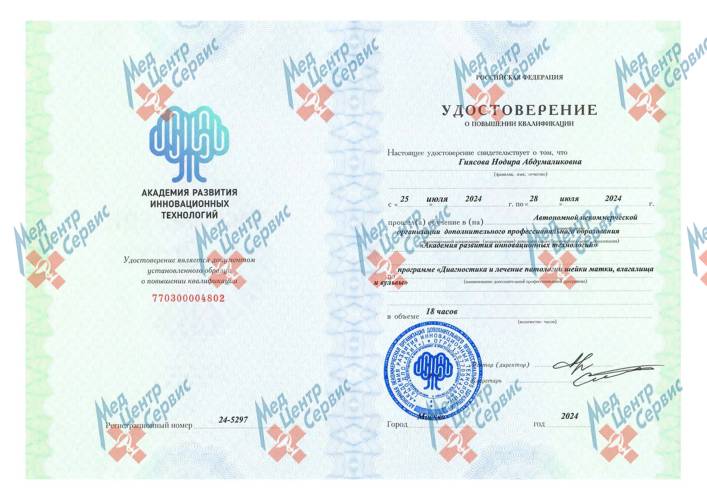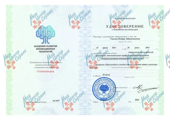 | 2024 г. | Повышение квалификации по программе «Диагностика и лечение патологии шейки матки, влагалища и вульвы». АНО ДПО «Академия развития инновационных технологий» |