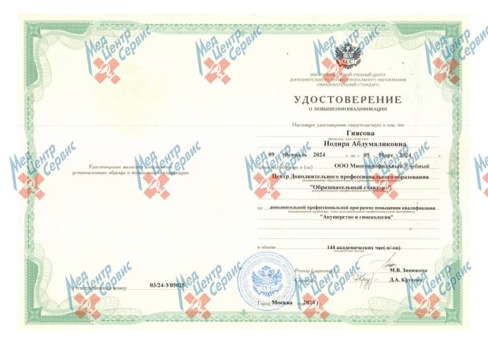 | 2024 г. | Повышение квалификации по дополнительной профессиональной программе «Акушерство и гинекология». МУЦ ДПО »Образовательный стандарт» |