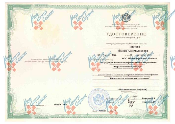 | 2022 г. | Повышение квалификации по дополнительной профессиональной программе "Психологическое доабортное консультирование". МУЦ ДПО "Образовательный стандарт" |