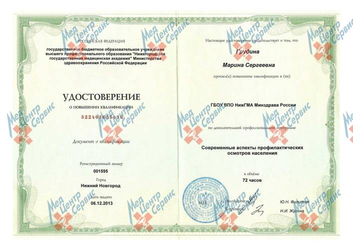 | 2023 г. | Повышение квалификации по дополнительной профессиональной программе «Современные аспекты профилактических осмотров населения». ГБОУ ВПО НижГМА Минзрава России |