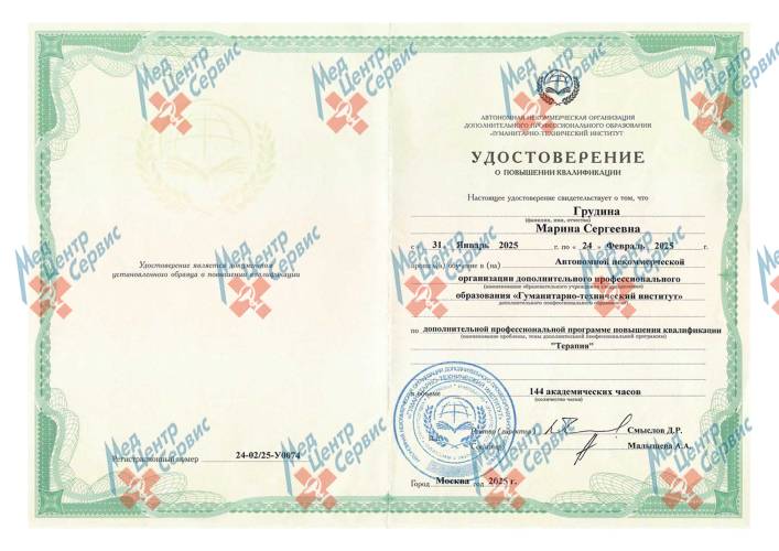 | 2025 г. | Повышение квалификации по дополнительной профессиональной программе «Терапия». АНО ДПО «Гуманитарно-технический институт» |