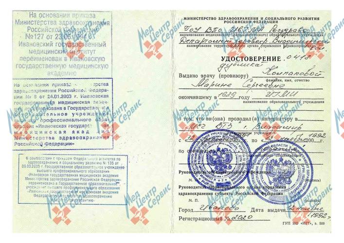 | 1992 г. | Интернатура по специальности «Терапия» в МСЧ ВТЗ г. Владимир |