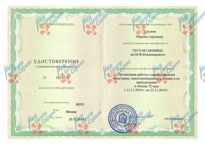 | 2019 г. | Повышение квалификации по курсу «Организация работы с наркотическими средствами, психотропными веществами и их прекурсорами». ГБУЗ МО МОНИКИ им. М.Ф. Владимирского |