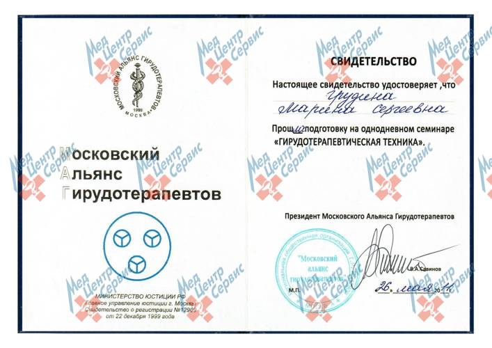 | 2011 г. | Подготовка на однодневном семинаре «Гирудотерапевтическая техника». Московский альянс гирудотерапевтов |