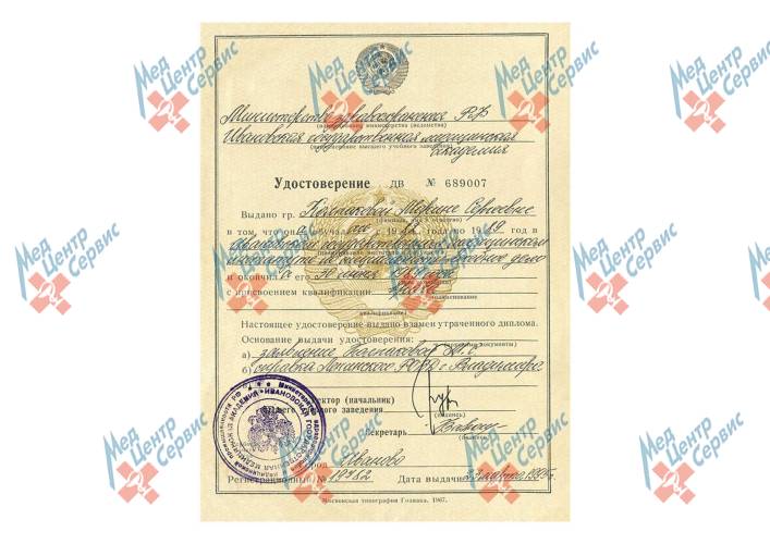 | 1989 г. | Диплом по специальности «Лечебное дело». Ивановский государственный медицинский институт |