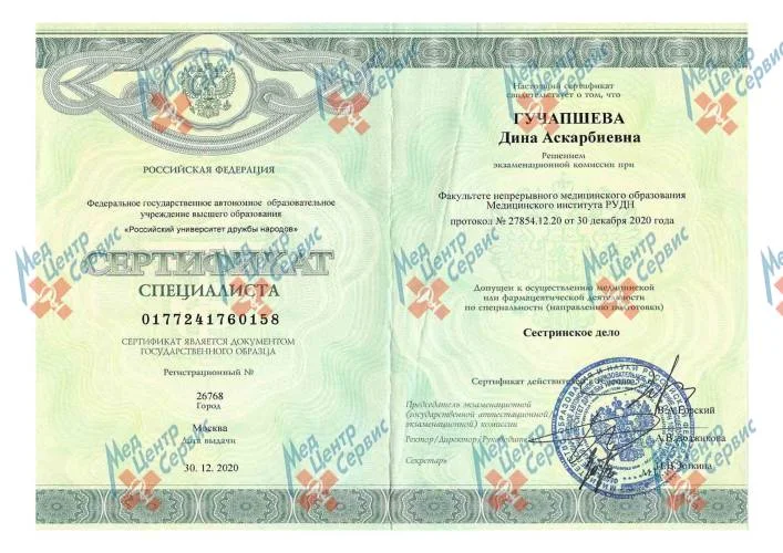 2020 г. | Повышение квалификации по специальности «Сестринское дело». ФГАОУ ВО РУДН |