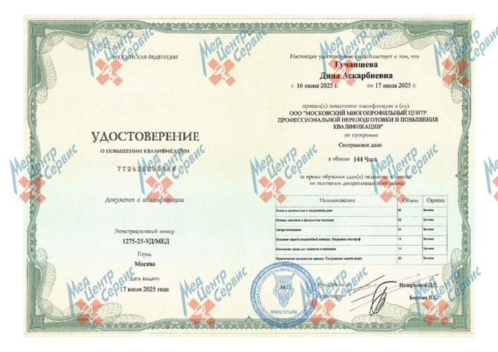 | 2025 г. | Повышение квалификации по программе «Сестринское дело». ООО «Московский многопрофильный центр профессиональной переподготовки и повышения квалификации» |
