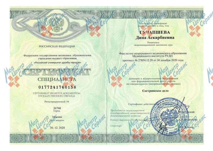 | 2020 г. | Повышение квалификации по специальности «Сестринское дело». ФГАОУ ВО РУДН |